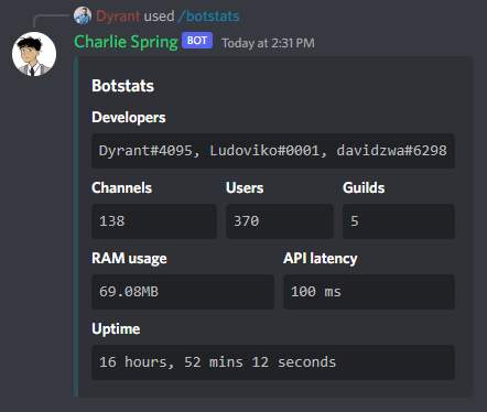 The botstats command is a command that shows some statistics about the Charlie bot.