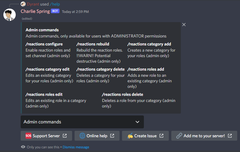 The help command shows some basic help information about the bot, including some useful links to additional resources