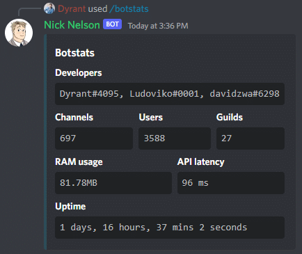 The botstats command is a command that shows some statistics about the Nick bot.