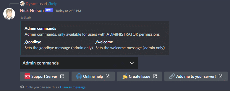 The help command shows some basic help information about the bot, including some useful links to additional resources
